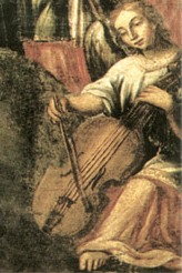 Музыка грае на басэтлі на фрагменце беларускага абраза ХVІІІ ст. "Багародзіца з хорам анёлаў"