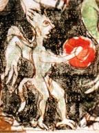 A demon with a bowl gong, a miniature fragment of the Radzivills’ Сhronicle Demons play in Monk Isaiah’s Cell, 15th-16th c.