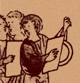 A singer with a bowl gong, a fragment of miniature David plays, scribes write, and people blow , Explanatory Psalter, early 16th c., Viĺnia School