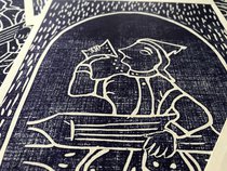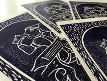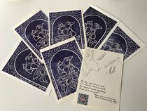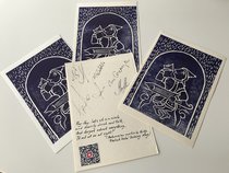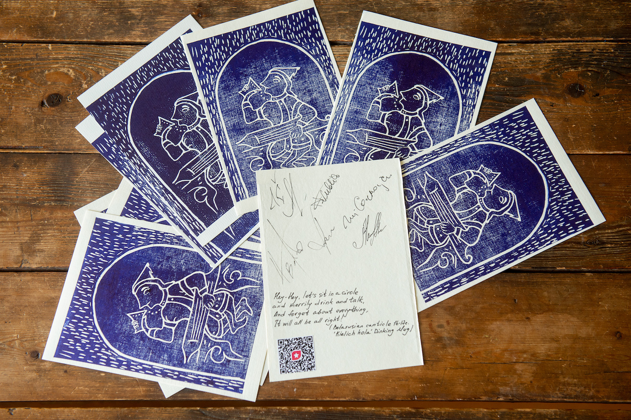 Открытка ручной работы в технике линогравюры с автографами участников группы. Ограниченная серия. Сделана флейтисткой группы Марией Шарий.