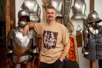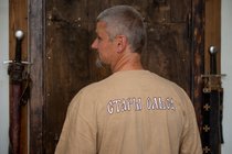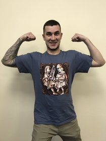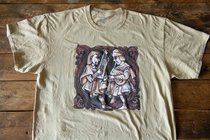 Мужская футболка "Стары Ольса" по мотивам альбома "Вір" с изображением волынщика и гусляра. Оригинальная работа гомельского художника Ю. Лупиненко. На спине - надпись Стары Ольса. Футболка спрессована и упакована в маленький кубик-брикет.