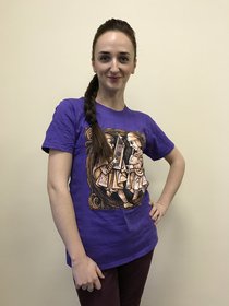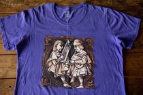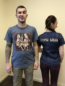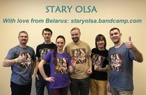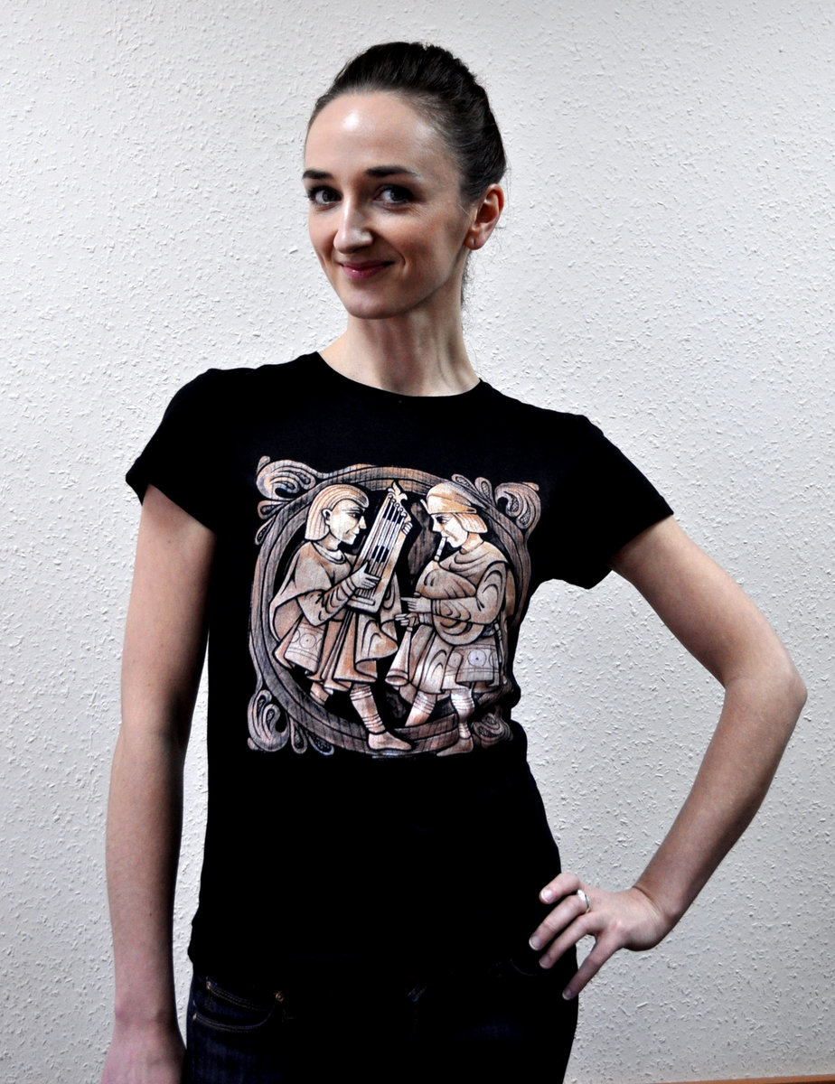 Женская приталенная футболка "Стары Ольса" по мотивам альбома "Вір" с изображением волынщика и гусляра. Оригинальная работа гомельского художника Ю. Лупиненко. На спине - надпись Стары Ольса. Футболка спрессована и упакована в маленький кубик-брикет.